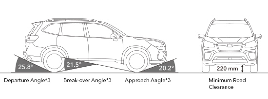 The Forester was designed for not only high SUV ground clearance, but also with careful consideration for approach, departure, and break-over angles. All have been optimised to help you conquer obstacles without sustaining damage or getting stuck.